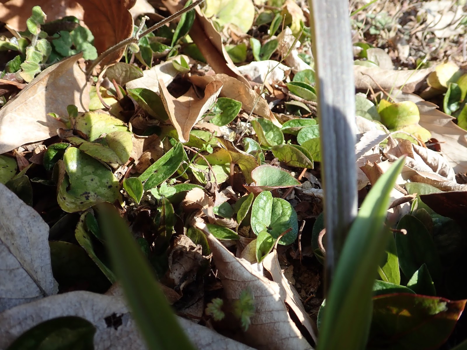 毎年、今頃になって思い出すタマカンアオイ(多摩寒葵)、南に面した陽のよく当たる場所では、生きにくそう、葉が全体に小さくなっていました。